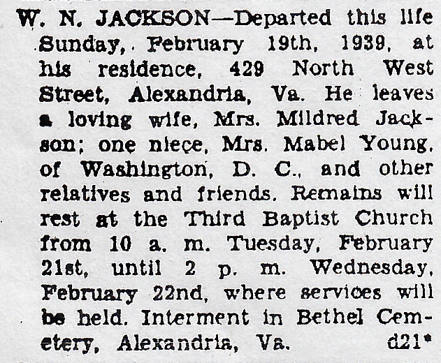 W N Jackson died on February 19, 1939 at his residence at 429 North West Street in Alexandria, Virginia. In his last will and testament, he made his last generous gift. Outside of Wash’s relatives, he gave his shares of stock that he owned in the Colored Fair Association of Fairfax, Virginia to the trustees of Third Baptist Church of Alexandria. He was also very generous to the Taylor family. He gave Catherine Taylor, Charles Taylor, Finley Taylor, Ellen Taylor and others $25 each in 1939.